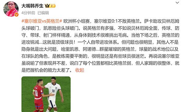 赛后名嘴韩乔生盛赞进球的贝林厄姆,称:说英格兰有多强,不如说贝林厄姆全面,传球、防守、带球、射门样样精通,从身体到技术很难挑出毛病。很明显当他下场之后,英格兰的进攻锐减…这就是顶级球员!一个人自带进攻体系。