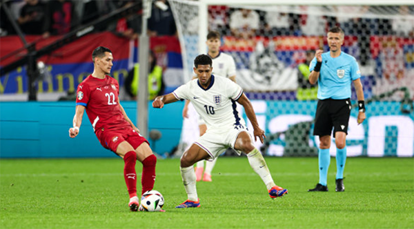 大赛的首战一直都不好踢,球员们需要展现出实力之外,还需要适应比赛和寻找状态,不过贝林厄姆延续在俱乐部良好的发挥,第13分钟,沃克直塞,萨卡跟进下底传中,门前包抄的贝林厄姆头球破门,打进英格兰队本届欧洲杯的首球,英格兰队1比0领先塞尔维亚。值得一提的是,贝林厄姆连续2届大赛为英格兰打入首球,2022世界杯也是他的头球建功,打进英格兰队的进球账户。