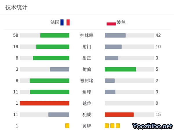第56分钟,姆巴佩主罚点球,斯科鲁普斯基猜错了方向,姆巴佩将球打进,法国队1-0波兰。