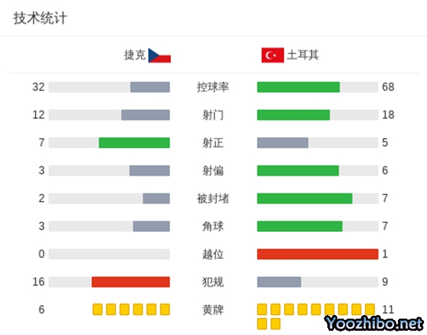 第51分钟,伊尔迪兹禁区内两连击被斯塔涅克扑出,随后尤克塞克直塞,恰尔汗奥卢小角度外脚背抽射远角入网,捷克0-1土耳其。