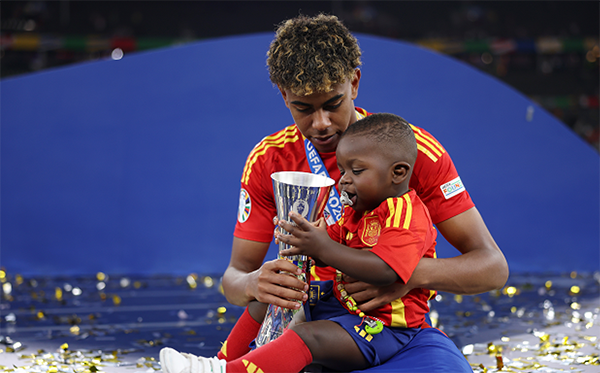 来源:24直播网07-15 11:3224直播网讯 北京时间7月15日,欧洲杯决赛结束争夺,最终西班牙队2比1击败英格兰,以7战全胜的战绩破纪录夺冠,加冕欧洲杯4冠王,夺冠次数最多。赛后的颁奖仪式,1球4助攻的亚马尔拿下最佳新人和助攻王、罗德里斩获欧洲杯MVP,奥尔莫等人获得欧洲杯金靴奖。英格兰队非常遗憾,欧洲杯的赛场上连续获得亚军,凯恩13年的职业生涯,依旧零冠。