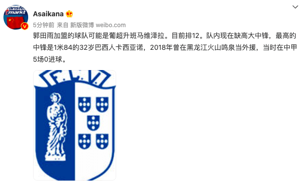 记者:郭田雨将在下个月租借加盟葡超球队维泽拉