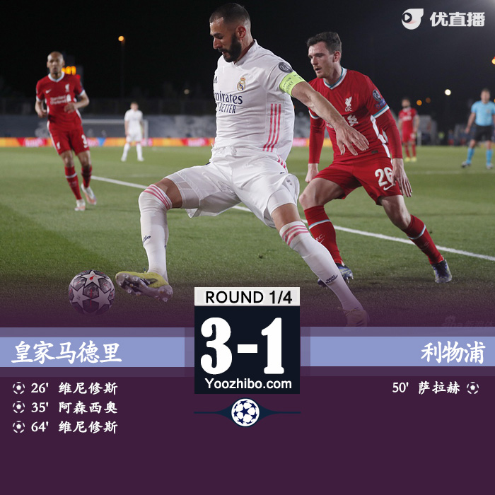 24直播网4月7日讯 北京时间4月7日凌晨3点整,2020-21赛季欧冠1/4决赛首回合在迪斯蒂法诺球场展开角逐,皇家马德里坐镇主场迎战利物浦。上半场维尼修斯打破僵局,阿诺德失误送礼,阿森西奥扩大比分,下半场萨拉赫扳回一城,维尼修斯梅开二度。最终皇家马德里主场3-1战胜利物浦,皇马占得晋级先机,双方将于4月15日移师安菲尔德球场进行次回合较量。