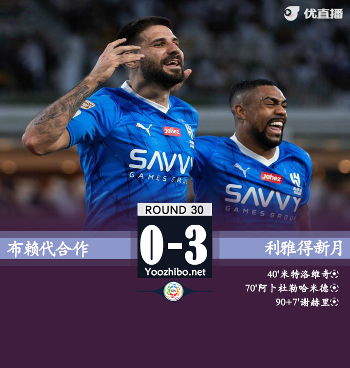 24直播网讯:北京时间5月3日23:00,沙特联第30轮,利雅得新月客场对战布赖代合作。上半场,迈克尔传中球送上助攻,米特洛维奇头球破门助新月取得领先;下半场,米林科维奇助攻阿卜杜勒哈米德破门锁定胜局,谢赫里补时再下一城。最终,利雅得新月3-0击败布赖代合作,29战27胜2平积83分,以12分优势领跑积分榜,布赖代合作积51分位列第四位。