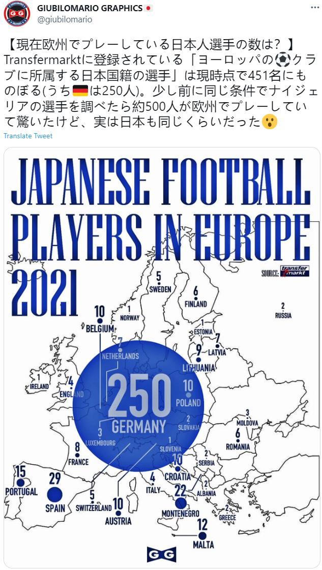 统计表明,目前共有451名日本球员在欧洲踢球,其中在德国踢球的日本球员有250人。