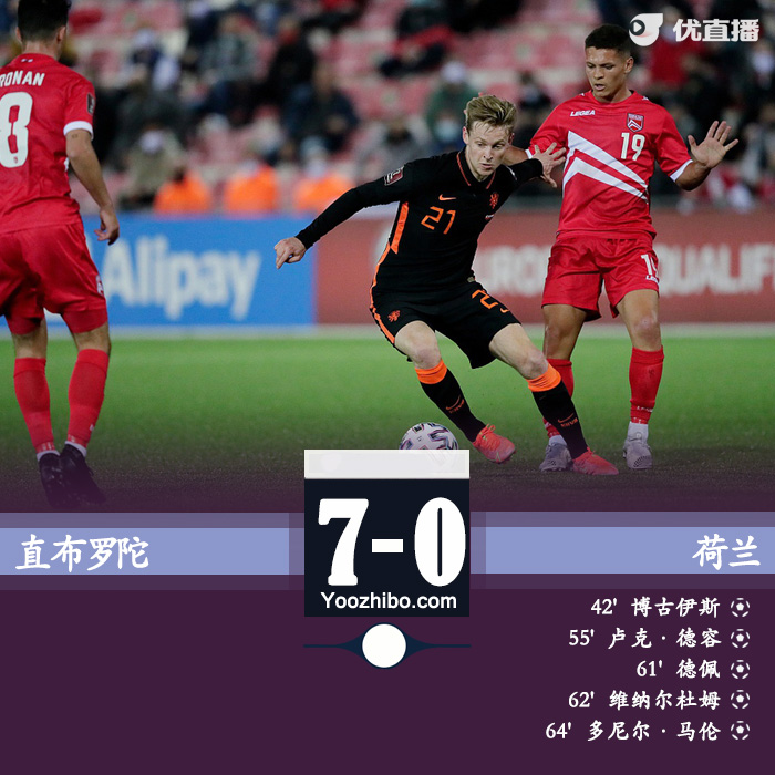 24直播网3月31日讯 北京时间3月31日凌晨2点45分,2022世界杯欧洲区预选赛G组第3轮展开角逐,荷兰队客场对阵直布罗陀。上半场,博古伊斯破门为荷兰队首开纪录。荷兰半场1-0领先。下半场,博古伊斯助攻吕克-德容破门,德佩打进两球,维纳尔杜姆、马伦和范德贝克先后破门,布林德因伤下场。最终荷兰客场7-0大胜直布罗陀。世预赛前三轮,荷兰取得2胜1负的战绩。