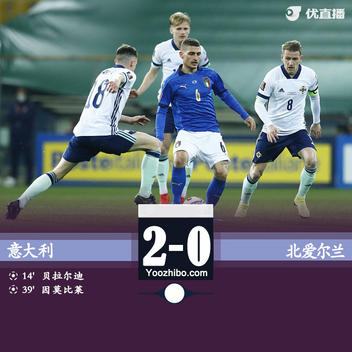 24直播网3月26日讯 北京时间3月26日3点45分,世预赛欧洲区C组意大利主场迎战北爱尔兰。上半场贝拉尔迪和因莫比莱各入一球,下半场两队再无建树,最终意大利主场2-0击败对手。