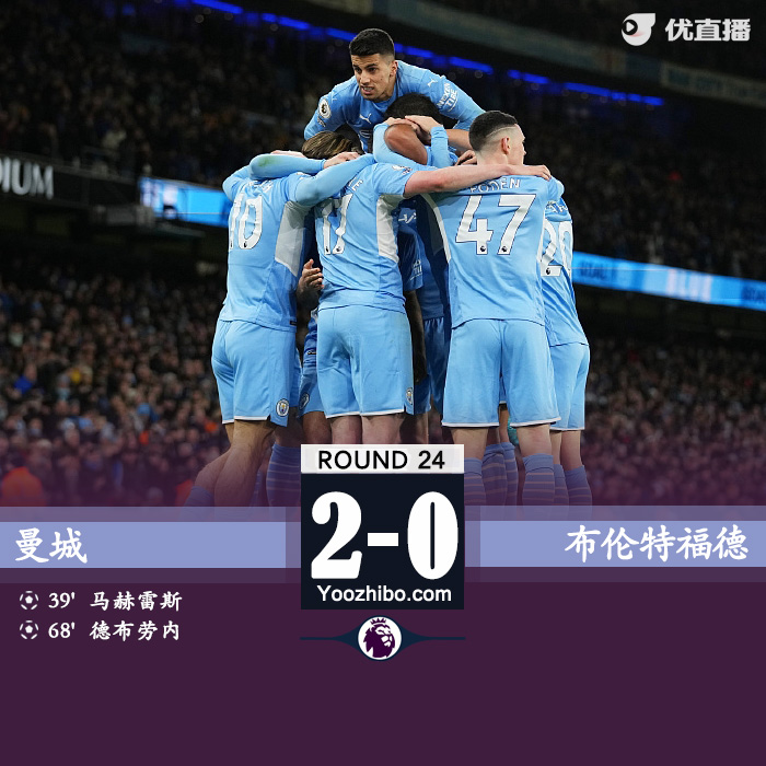 24直播网2月10日讯 北京时间2月10日03:45,英超第24轮继续进行,曼城主场迎战布伦特福德。上半场,斯特林制造点球,马赫雷斯主罚命中。下半场,德布劳内利用大卫-拉亚的失误再入一球。最终,曼城2-0战胜布伦特福德14轮不败,12分优势继续领跑积分榜。