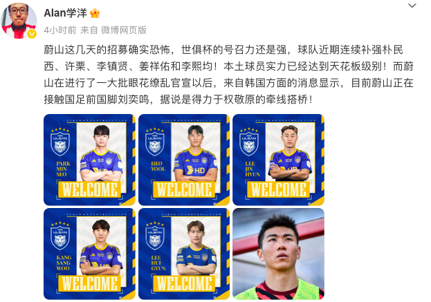 而除了有意签下刘奕鸣之外,蔚山HD近期连续引进朴民西、许栗、李镇贤、姜祥佑和李熙均等本土名将补强阵容。蔚山HD是K1联赛卫冕冠军,并且完成了3连冠,不过蔚山在本赛季亚冠精英联赛却表现糟糕。