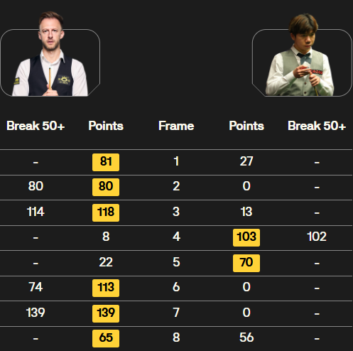 第四局 雷佩凡开球之后,特鲁姆普又是精准远台打进,不过单杆得到8分进攻出现了失误,雷佩凡打进红球之后没有彩球衔接,双方进入防守模式,雷佩凡抓住机会,强势单杆轰出102分,103-8赢下第四局,雷佩凡1-3特鲁姆普。