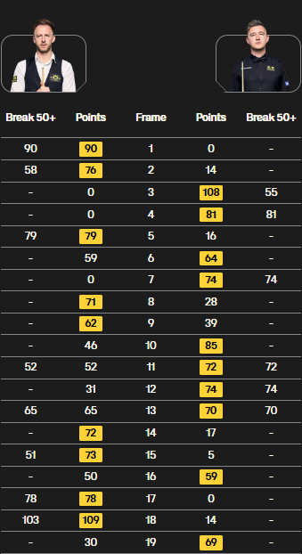第18局:特鲁姆普防守失误,凯伦-威尔逊上手单杆得14分,打进粉球炸开红球堆时一颗红球意外进袋被罚6分,特鲁姆普上手单杆轰出103分,109-14赢下此局,特鲁姆普9-9平,双方进入决胜局。