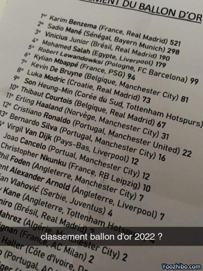 网上流传的排名显示,本泽马521分位居第一,优势非常明显,马内298分排名第二,维尼修斯190分排名第三。