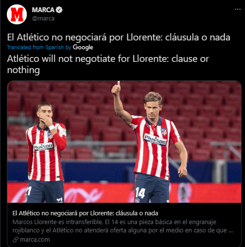 马竞表示,除非有球队激活略伦特的违约金(1.2亿欧元),否则谁也无法带走略伦特。不过此前有多名马竞球员被支付违约金的方式挖走,比如卢卡斯、罗德里、格列兹曼和托马斯。