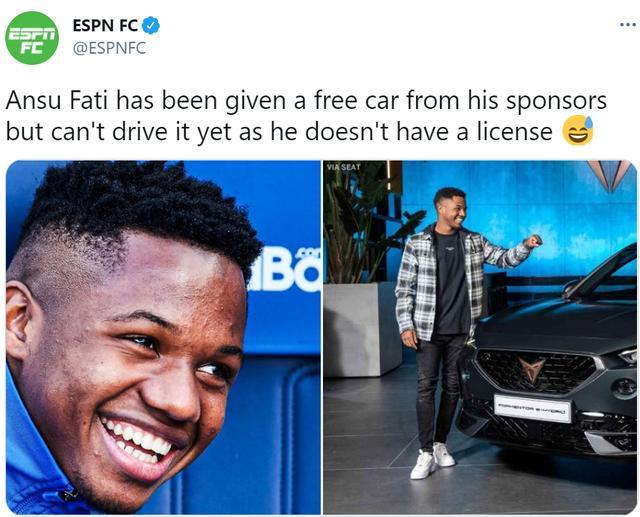 24直播网3月26日讯 据ESPN报道,巴萨天才小将法蒂最近获得俱乐部汽车赞助商赠送的一辆汽车,但他目前仍未考取驾照,所以还没有办法开车。