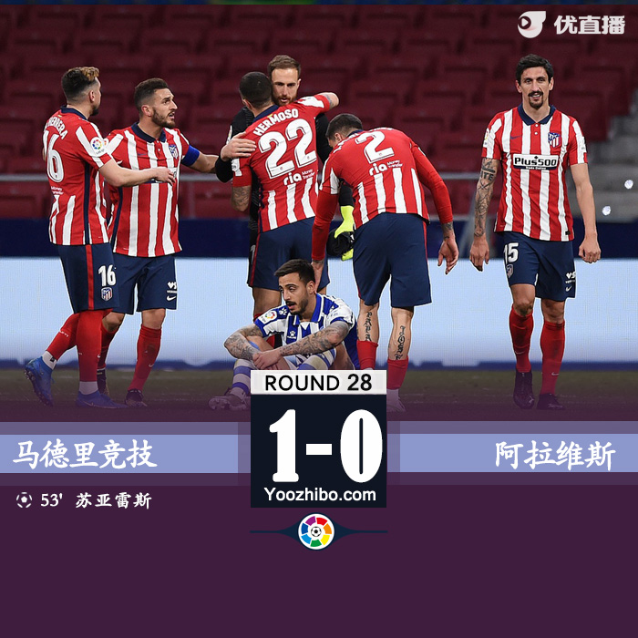 全场比赛结束,马德里竞技1-0阿拉维斯。