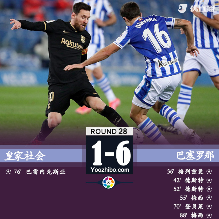 下半场补时4分钟,最终全场比赛结束,巴萨6-1大胜皇家社会。