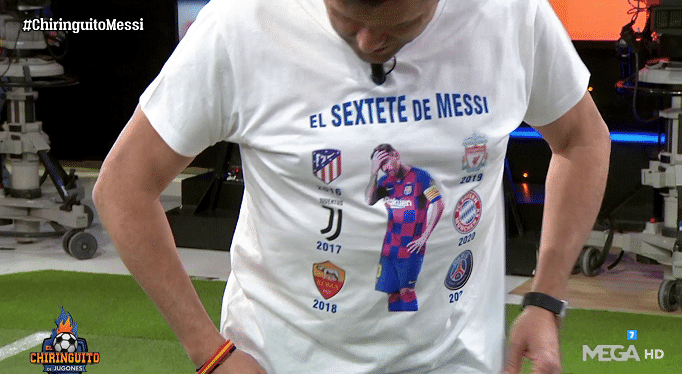 梅西踢丢了点球,这也让不少讨厌梅西的球迷们觉得高兴,这其中一名外国的梅西黑粉还专门制作了一件特殊的T恤,T恤最中间是黯然神伤的梅西,然后围绕在他身边的是马竞、尤文、罗马、利物浦拜仁和大巴黎的队徽,寓意是最近六个赛季以来,梅西所在的巴萨在欧冠赛场上被这6支球队淘汰出局。
