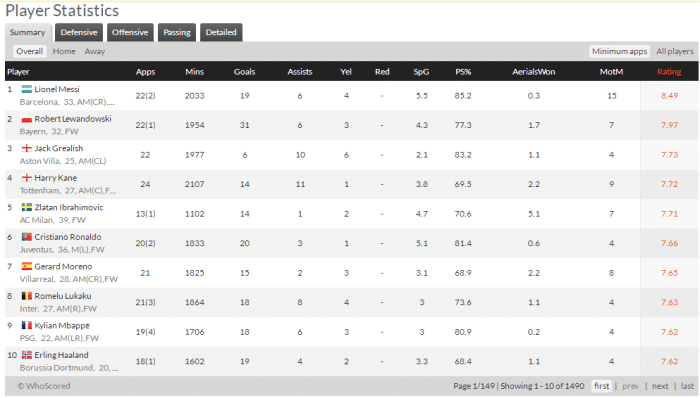如图,梅西的场均评分高达8.49分,是所有球员中场均评分最高的,也是唯一一个场均评分超过8分的球员。而排名第二的是拜仁前锋莱万,他的场均评分是7.97分,莱万的表现和梅西还是有不小的差距的。而排名第三的是维拉的格拉利什,他的场均评分是7.73分。第四到第十分别是凯恩的7.72分,伊布的7.71分,C罗的7.66分,莫雷诺的7.65,卢卡库的7.63分,姆巴佩和哈兰德的7.62分。