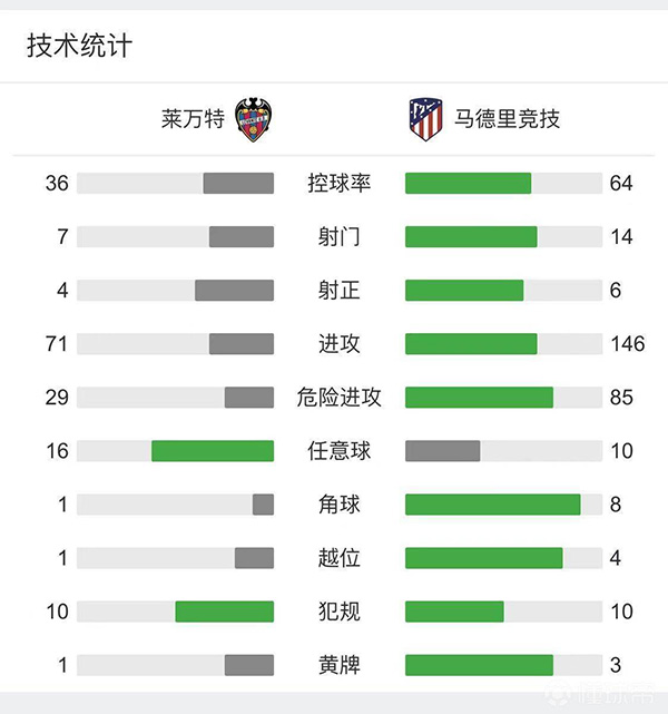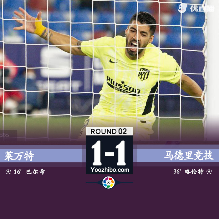 全场比赛结束,莱万特1-1马德里竞技。