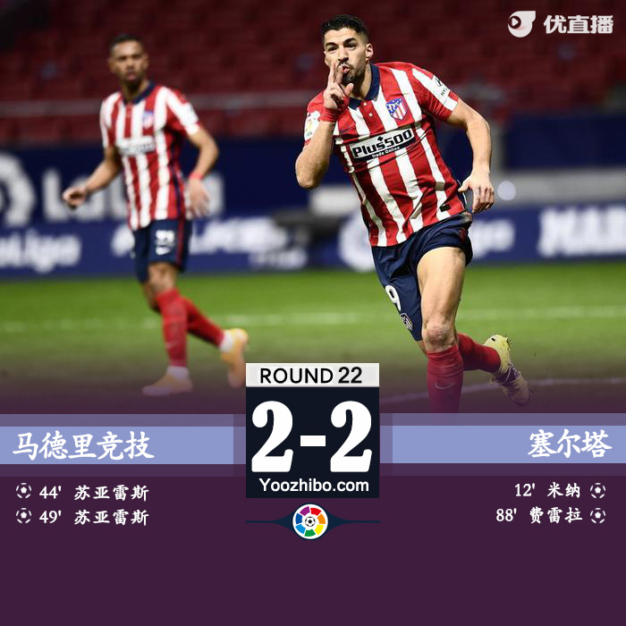 全场比赛结束,马德里竞技2-2塞尔塔。