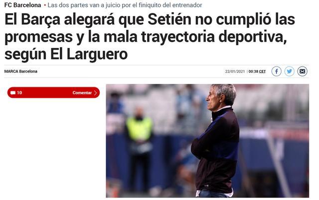 根据此前消息,塞蒂恩要求巴萨支付他剩余一年半合同的薪水,但巴萨认为这位教练带队表现无能,因此并不愿意这么做,现在双方将对簿公堂。