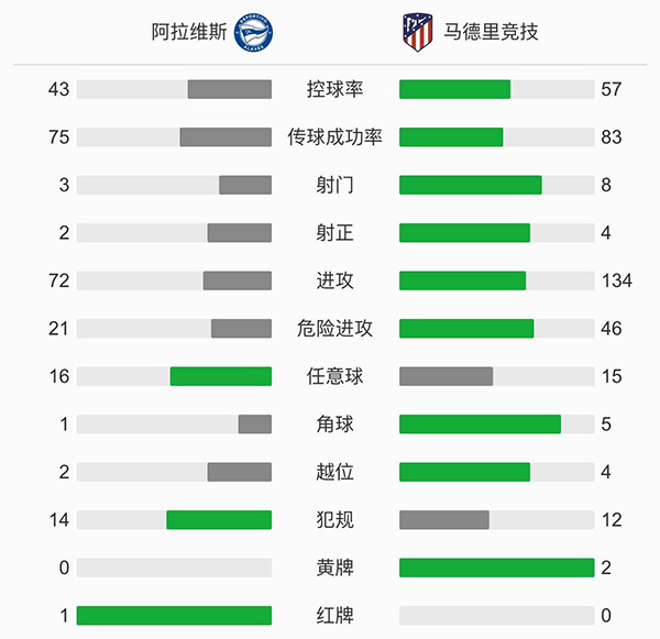第41分钟阿拉维斯传球失误,苏亚雷斯分球,马科斯-略伦特横向摆脱后左脚低射,皮球碰到拉瓜迪亚变线钻入球门!马竞客场1-0领先阿拉维斯。