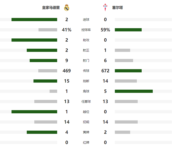 塞尔塔首发:13-鲁文-布兰科、15-奥拉萨、24-穆里略、4-阿劳霍、2-马略、14-塔皮亚、6-德尼斯-苏亚雷斯、9-诺利托(64`27-米格尔-巴埃萨)、23-布赖斯-门德斯、22-米纳、10-阿斯帕斯(51`8-贝尔特兰)
