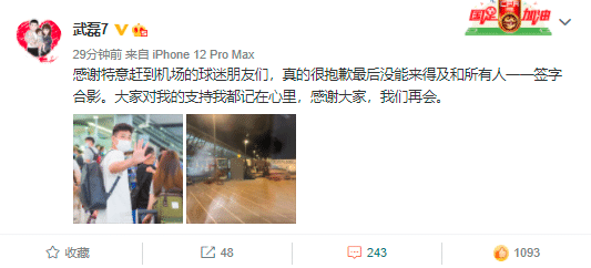 武磊发微博表示:“感谢特意赶到机场的球迷朋友们,真的很抱歉最后没能来得及和所有人一一签字合影。大家对我的支持我都记在心里,感谢大家,我们再会。”