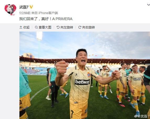 赛后,武磊非常开心并且更新了社交媒体,武磊在微博中写道:“我们回来了,真好!A PRIMERA”