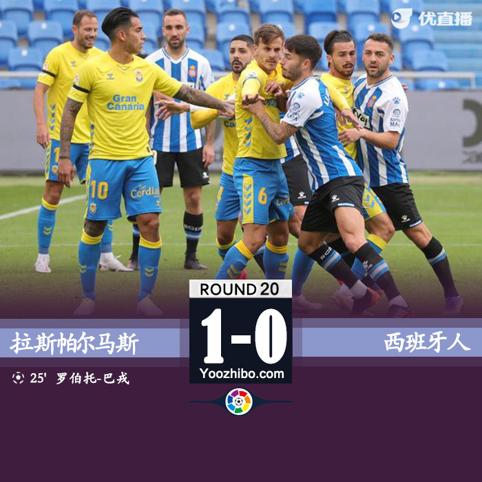 第26分钟,拉斯帕尔马斯第1球!罗伯托-巴戎!外围连续头球接力后,卡斯特拉诺横推,巴戎抢射破门!拉斯帕尔马斯1-0西班牙人!