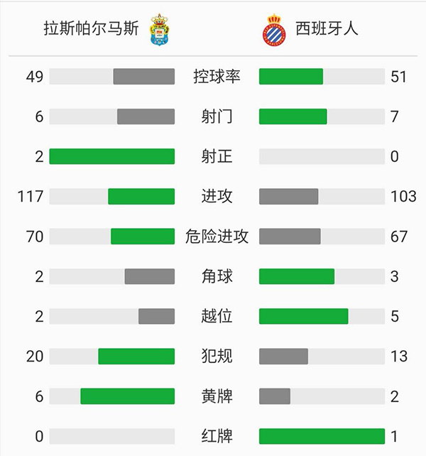 西班牙人0-1拉斯帕尔马斯 尤易斯染红武磊替补登场