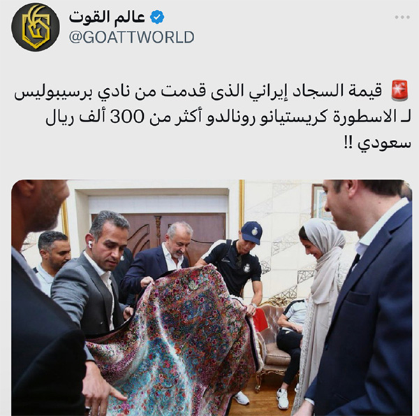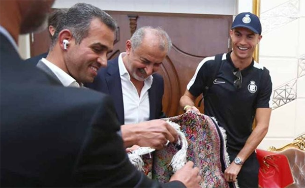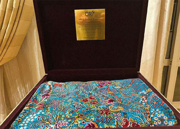 C罗和马内抵达伊朗,获得特别的对待,波利波利斯向C罗和马内送上了特色毛毯作为礼物,上面有C罗和马内的名字,在包装非常精美的盒子里面。很快就有媒体表示赠送C罗的波斯地毯价值30万里亚尔,折合大约60万人民币,可以说相当贵重的礼物。