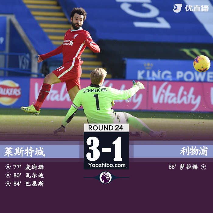 24直播网2月13日讯北京时间2月13日20点30分,英超第24轮莱斯特城主场迎来强敌利物浦。上半场,米尔纳伤退,利物浦呈现围攻之势但未能破门,小舒梅切尔多次做出成功扑救,瓦尔迪反击射中横梁。下半场,阿诺德任意球攻门击中横梁,萨拉赫兜射破门,麦迪逊任意球扳平比分,利物浦后防失误送礼,瓦尔迪打进反超球,巴恩斯锁定胜局,全场比赛结束,莱斯特城3-1利物浦。本场比赛过后,莱斯特城在多赛2场的情况下拿到46分升到积分榜第二,落后榜首的曼城4分。利物浦遭遇三连败后则是以40分继续排在第四,在先赛一场的情况下仅领先身后的切尔西和西汉姆1分。