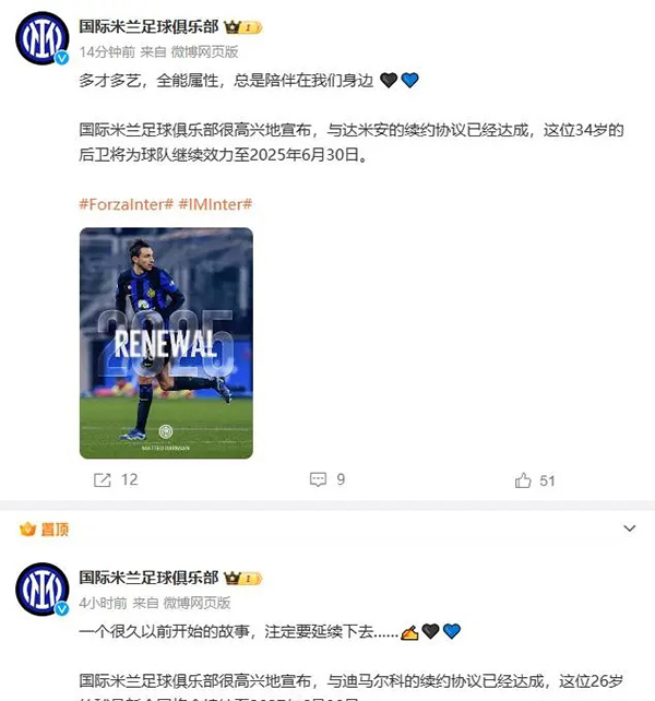 来源:24直播网12-31 17:4524直播网12月31日讯 ,国际米兰足球俱乐部官方宣布,分别与达米安、迪马尔科续约至2025年和2027年6月30日。