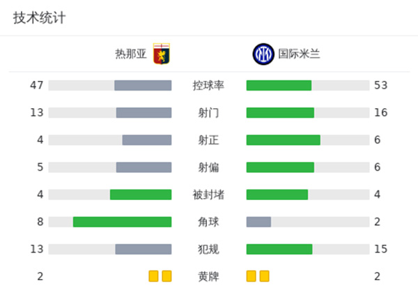 来源:24直播网12-30 07:04 24直播网讯:北京时间12月30日凌晨03:45,意甲联赛第18轮,国际米兰做客路易吉-费拉里斯球场,挑战热那亚,本场比赛主裁判为多维里。上半场,阿瑙托维奇补射打破僵局,德拉古辛头球扳平比分。下半场,阿瑙托维奇爆射制造威胁,阿切尔比头球造险。最终,热那亚1-1国际米兰。
