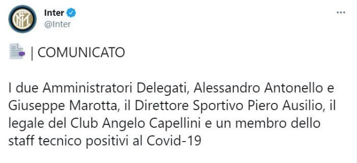 两位董事代表:安东内罗和马洛塔,体育总监奥西里奥,俱乐部律师卡佩里尼以及一名俱乐部工作人员,共计5人在最新的核酸检测中呈阳性。