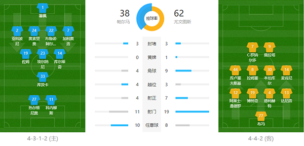 帕尔马首发:1-塞佩、2-雅克波尼(60'42-布斯)、7-加利奥洛、22-布鲁诺-阿尔维斯、14-库尔蒂奇(85'15-布鲁曼)、19-索姆、23-埃尔纳尼、33-库茨卡(60'18-西普里安)、11-科尼利厄斯(61'45-因格莱塞)、24-奥索里奥、27-热尔维尼奥(46'10-卡拉莫)