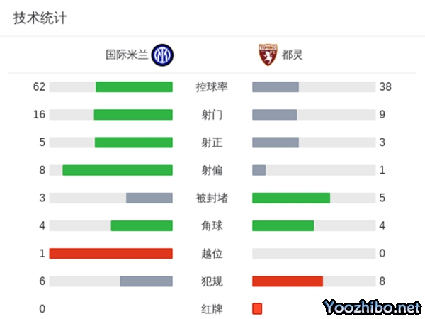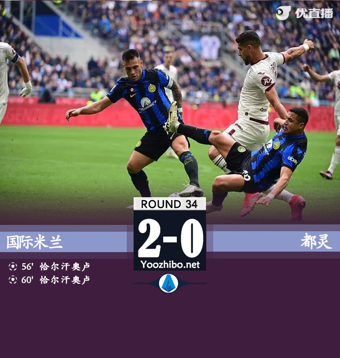 最终,国米主场2-0击败十人都灵。