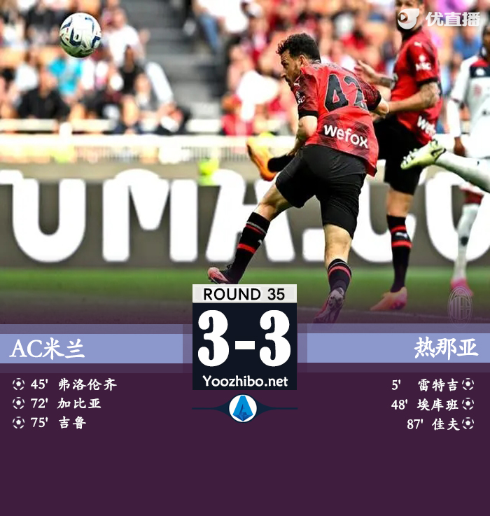 24直播网讯:北京时间5月6日0:00,意甲第35轮AC米兰主场迎战热那亚。上半场,托莫里开场3分钟送点,雷特吉点射帮助热那亚领先;普利西奇兜射中柱;弗洛伦齐半场读秒阶段扳平比分。下半场,埃库班头球帮助热那亚再次领先;丘库埃泽破门但越位无效;加比亚头球帮助米兰再度扳平,吉鲁失良机后打入反超进球;佳夫最后时刻乌龙!最终AC米兰主场3-3热那亚,联赛4轮不胜。