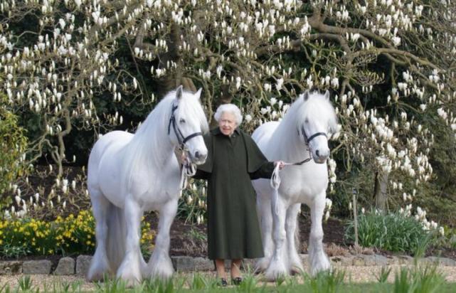 96岁生日那天,英国媒体发布了女王的一张最新照片,她牵着两匹爱马,面露笑容。女王登基70周年时,一些国家的政要也为她送来了马匹作为贺礼。上个月,阿塞拜疆总统伊利哈姆·阿利耶夫为女王送来了一匹名叫Shohrat的栗色卡拉马赫小马。法国总统马克龙也送来了一匹深灰斑纹的小马。在登基70周年的庆典上,一共有1200名士兵、400位音乐家参与,当然也没少了女王最爱的马,至少240匹马出现在庆典上。