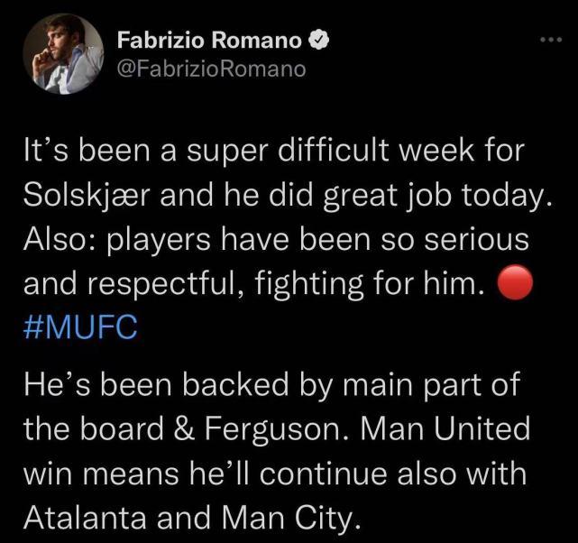 而这场胜利,也成功让索尔斯克亚“转危为安”。罗马诺透露,索尔斯克亚已经得到了曼联董事会主要成员和弗格森爵士的支持,他将暂时不会下课,而是继续带领球队迎战亚特兰大和曼城的两场关键比赛。