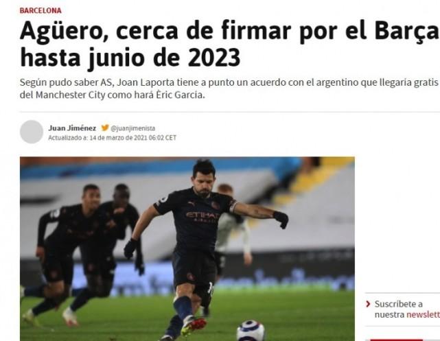 来源:24直播网03-14 20:5024直播网讯 北京时间3月14日,来自西班牙知名媒体《阿斯报》驻巴塞罗那记者Juan Jimenez的消息,效力于曼城的前锋阿奎罗,已经与巴萨新任主席拉波尔塔达成了协议,他将会在今夏自由身加盟巴萨俱乐部。据悉,阿根廷射手将会与巴萨签约2年,合同至2023年。