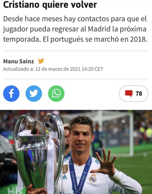 曝C罗回归皇马意愿强烈:想再拿1座欧冠!双方已接触数月,尤文愿放人