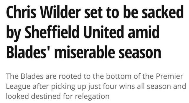 来源:24直播网03-12 20:0324直播网讯 北京时间3月12日,来自英国权威媒体《泰晤士报》的消息,英超“副班长”谢菲联已经决定解雇球队的主帅克里斯-怀尔德,预计在今天就对外官方宣布。这位53岁的英格兰土帅,也即将成为继比利奇(西布朗)和兰帕德(切尔西)之后,本赛季英超第三位中途下课的主帅。
