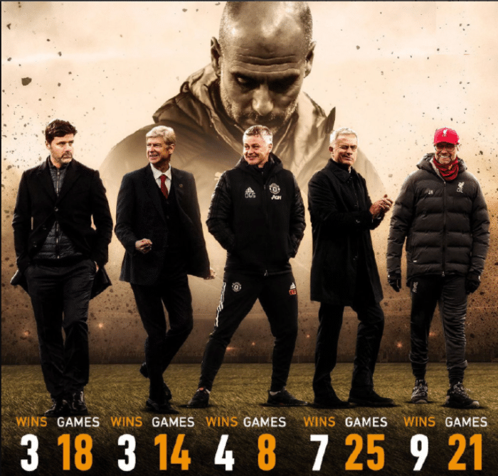 而随后是曼联主帅索尔斯克亚,索尔斯克亚8次对阵瓜迪奥拉拿到了4次胜利,而剩下四场比赛是1平3负。索尔斯克亚对阵瓜迪奥拉的胜率是50%,是所有主帅中最高的。而随后是温格和波切蒂诺,温格14次带队对阵瓜帅的球队,只拿下了3场胜利。而波切蒂诺18次带队对阵瓜迪奥拉的球队,拿到了3次胜利。不过,前年欧冠关键场次波帅赢球了。