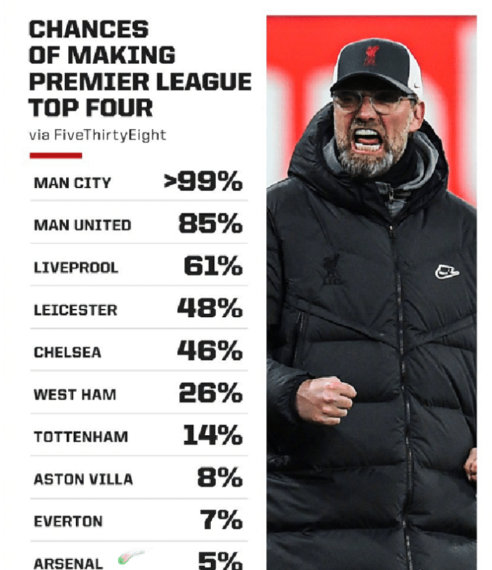 英超球队争四概率:利物浦仍被看好,阿森纳依然有5%的几率!