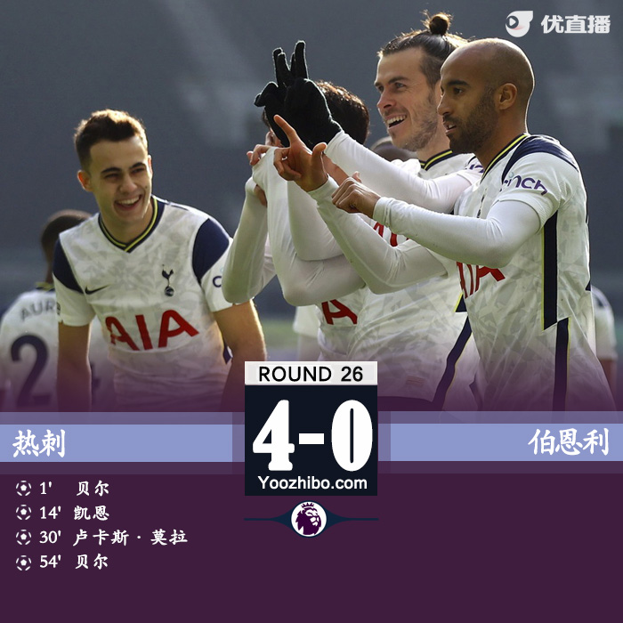 全场比赛结束,热刺4-0伯恩利。