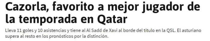 阿斯:卡索拉当选卡塔尔联赛MVP只是时间问题