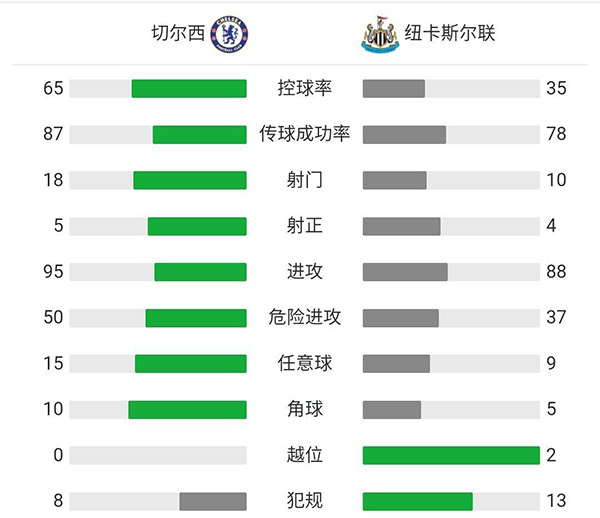 全场比赛结束,切尔西2-0纽卡斯尔。