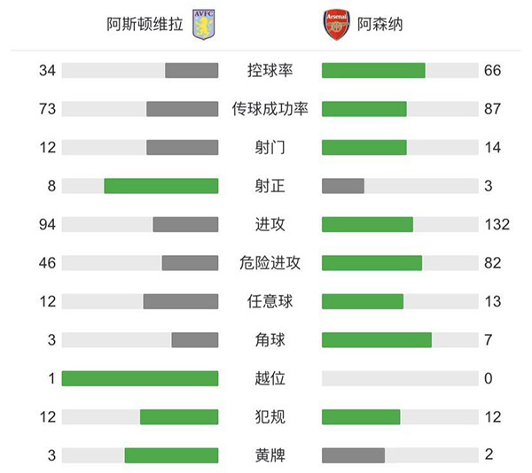 全场比赛结束,阿森纳0-1阿斯顿维拉。